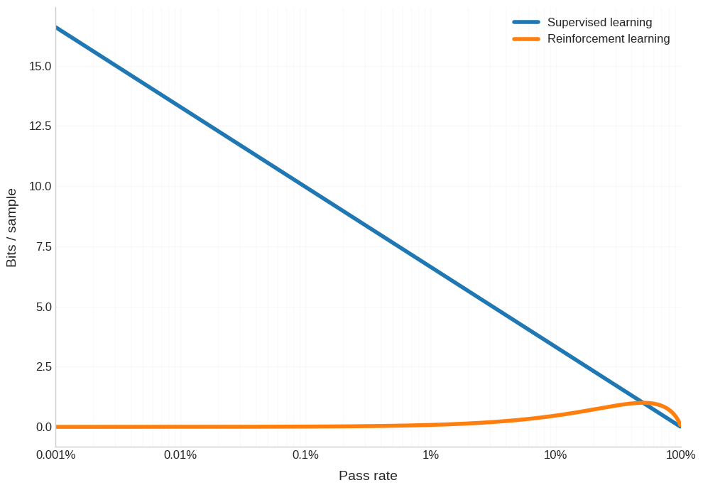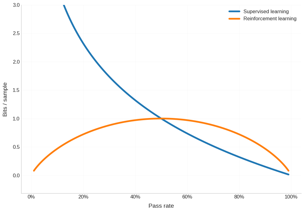 In RL, you only get told whether you got the right answer or not. The amount of new information you can extract is bounded by how uncertain you are about this binary outcome. If you almost always pass (p ≈ 1) or almost always fail (p ≈ 0), each trial is very unlikely to surprise you. You’ll learn most when the probability of passing is like a coin toss (p ≈ 0.5). The basic formula for the information content of a binary random variable tells us that you can learn at most Entropy(p) = -p log(p) - (1-p) log(1-p) bits/sample from RL.